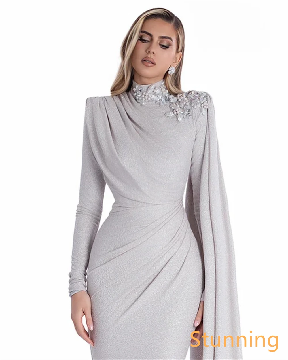 Customized Delicate Silvery Jersey Evening Dress Mermaid High Collar Long Sleev
