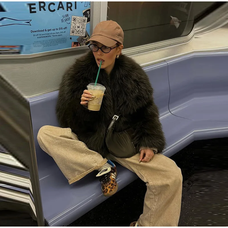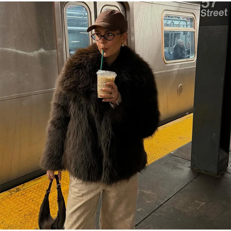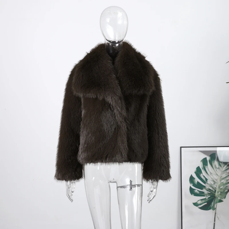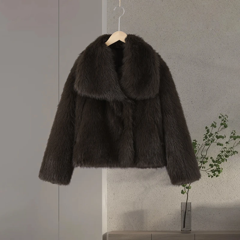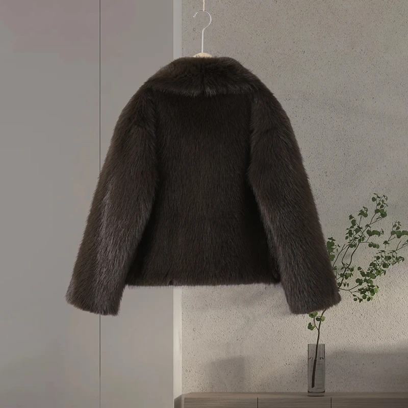 Elegant Luxury Thicken Brown Faux Fur Coats Women Loose Lapel Long Sleeve Furry