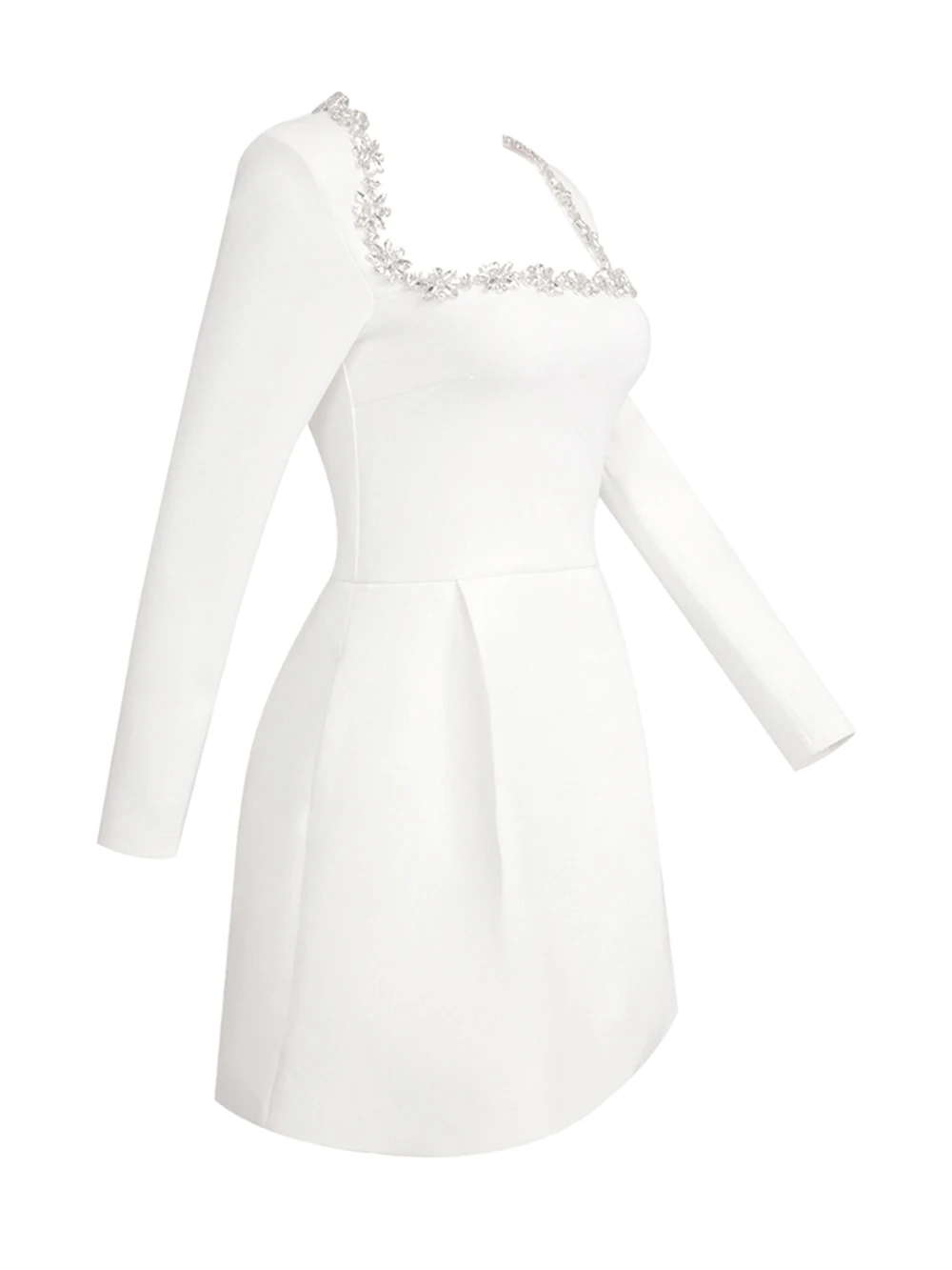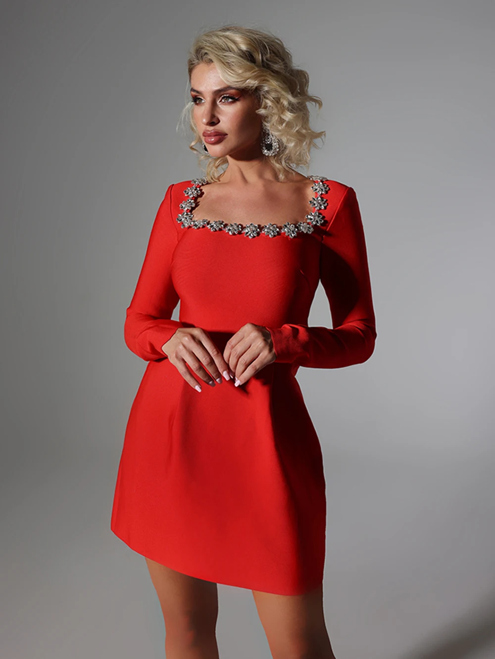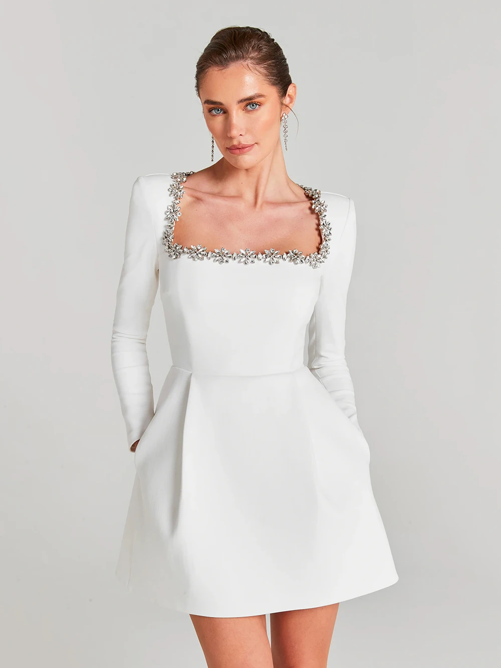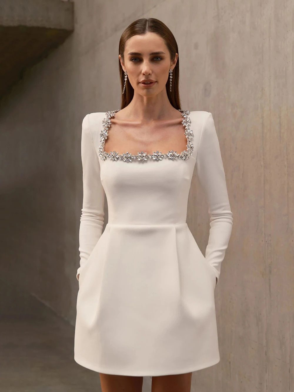 Modphy Elegant Mini Square Collar Diamond Evening Dress Short A-Line Long Sleeve