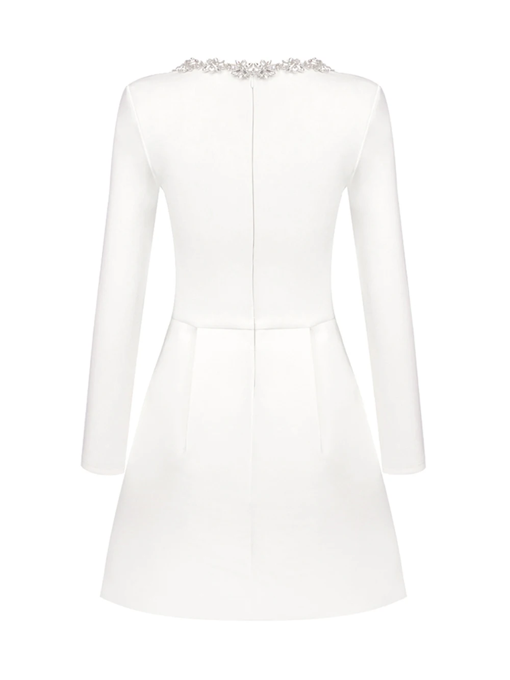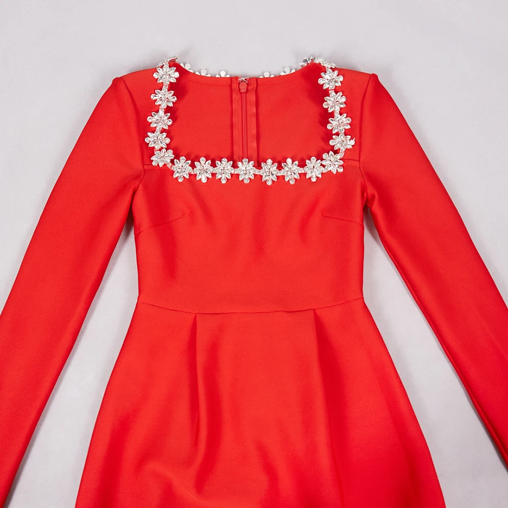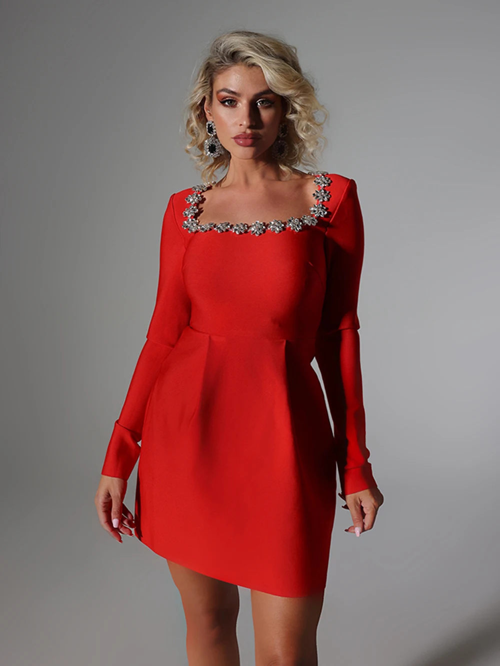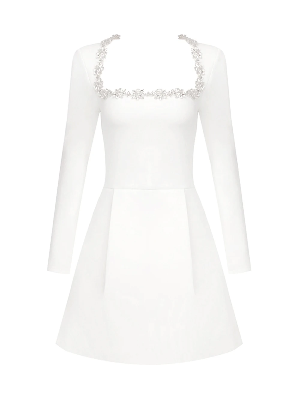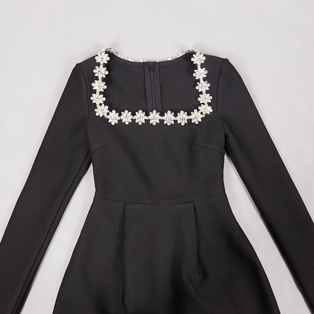 Modphy Elegant Mini Square Collar Diamond Evening Dress Short A-Line Long Sleeve