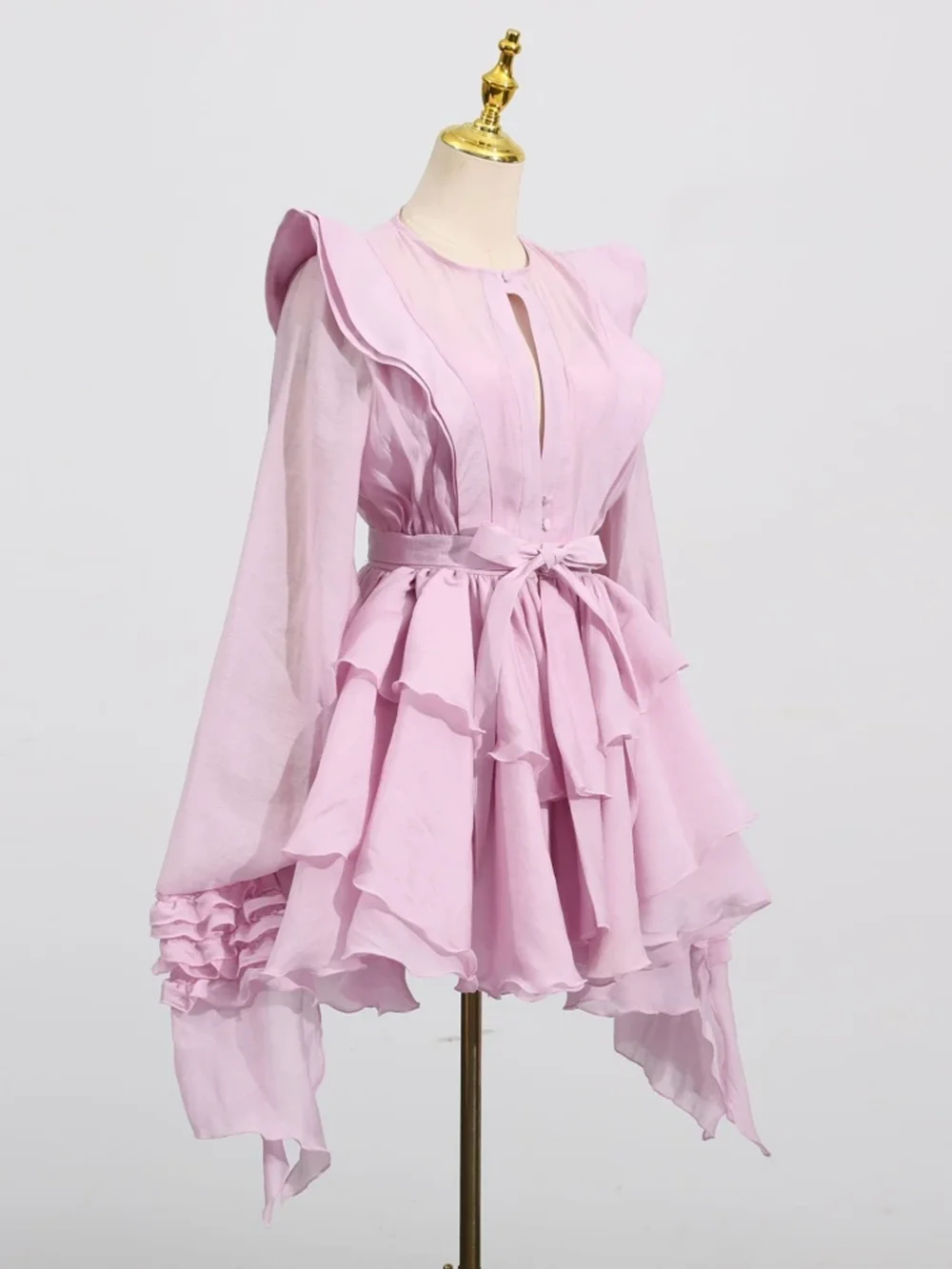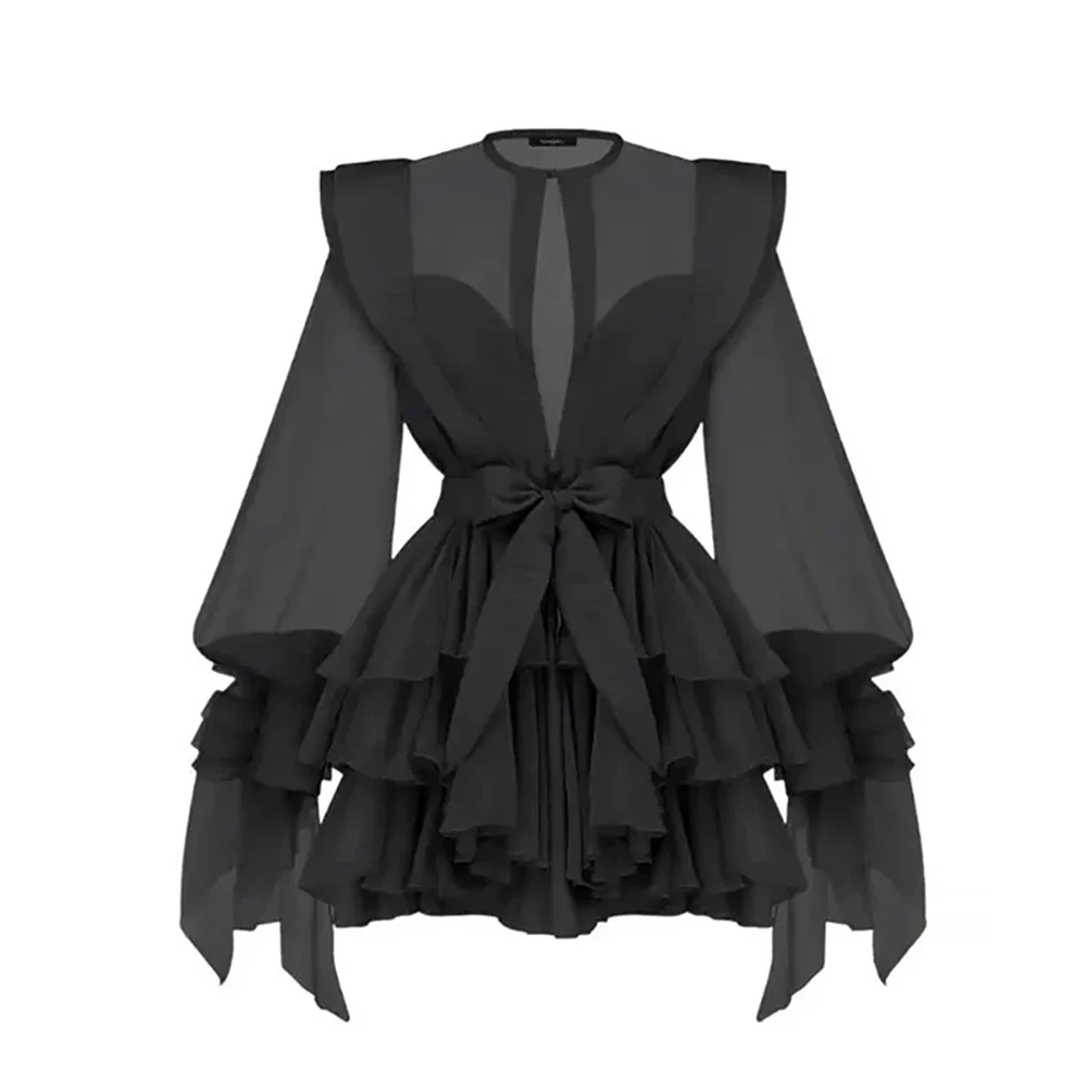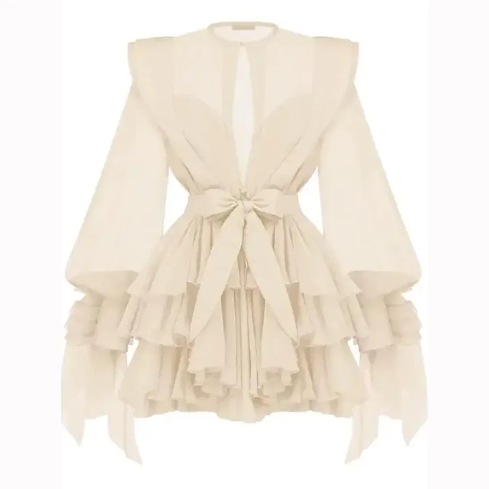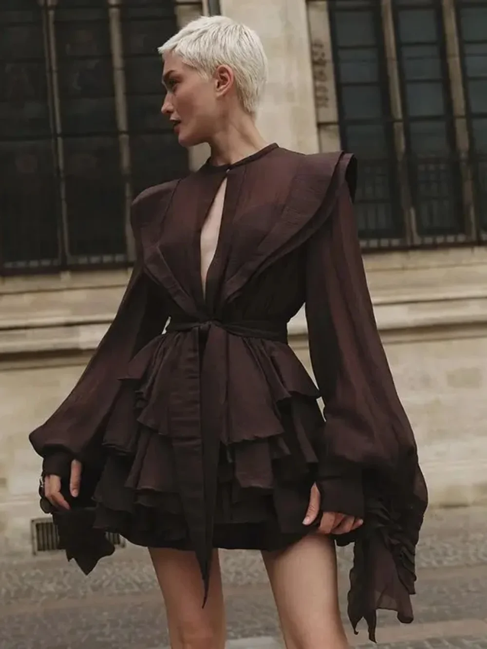 Modphy Fashion Women Ruffles Short Dress Elegant O-Neck Lace Up Lantern Long Sle
