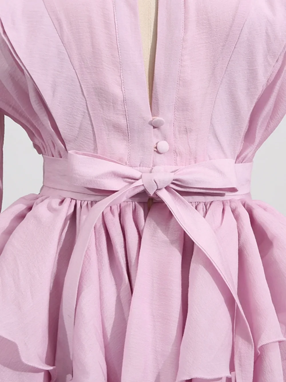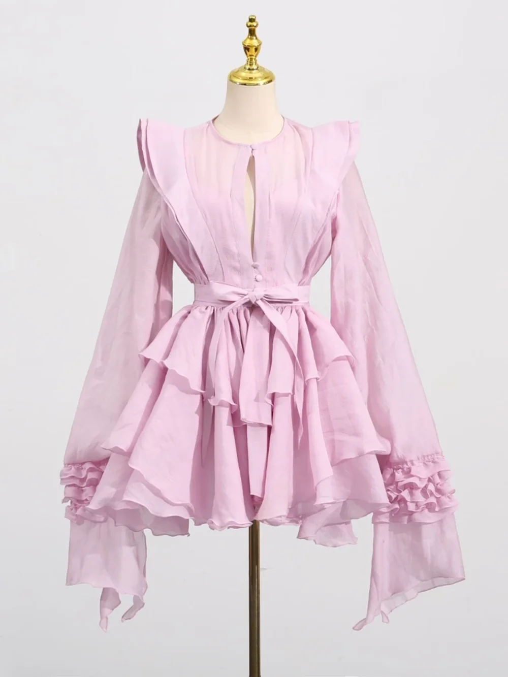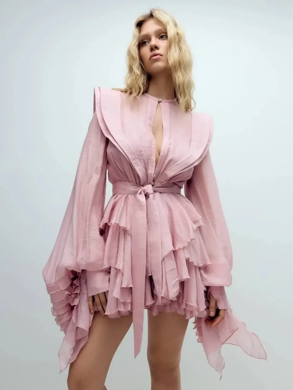 Modphy Fashion Women Ruffles Short Dress Elegant O-Neck Lace Up Lantern Long Sle