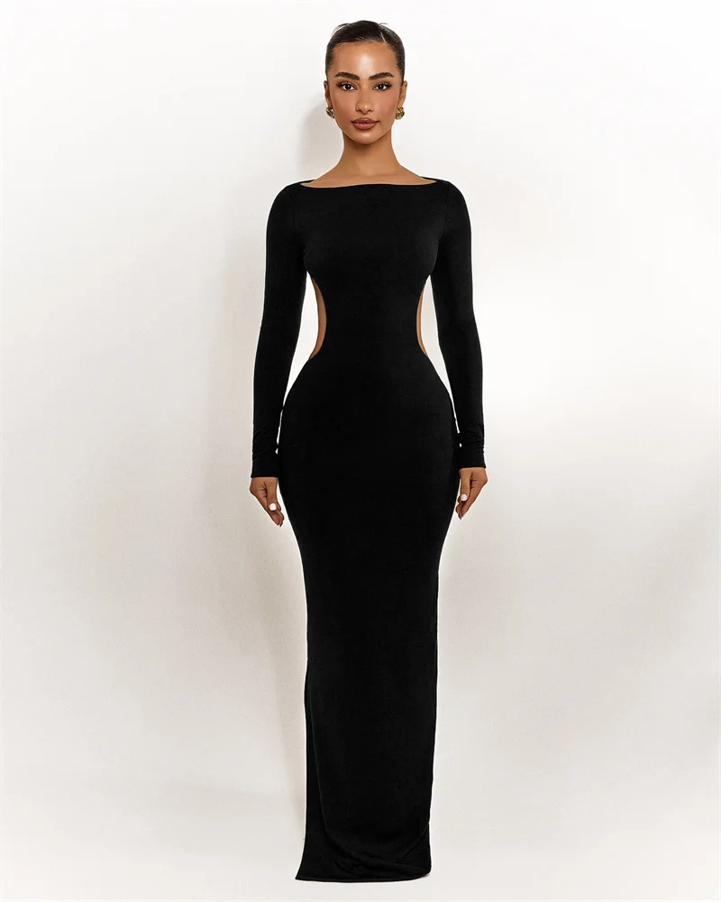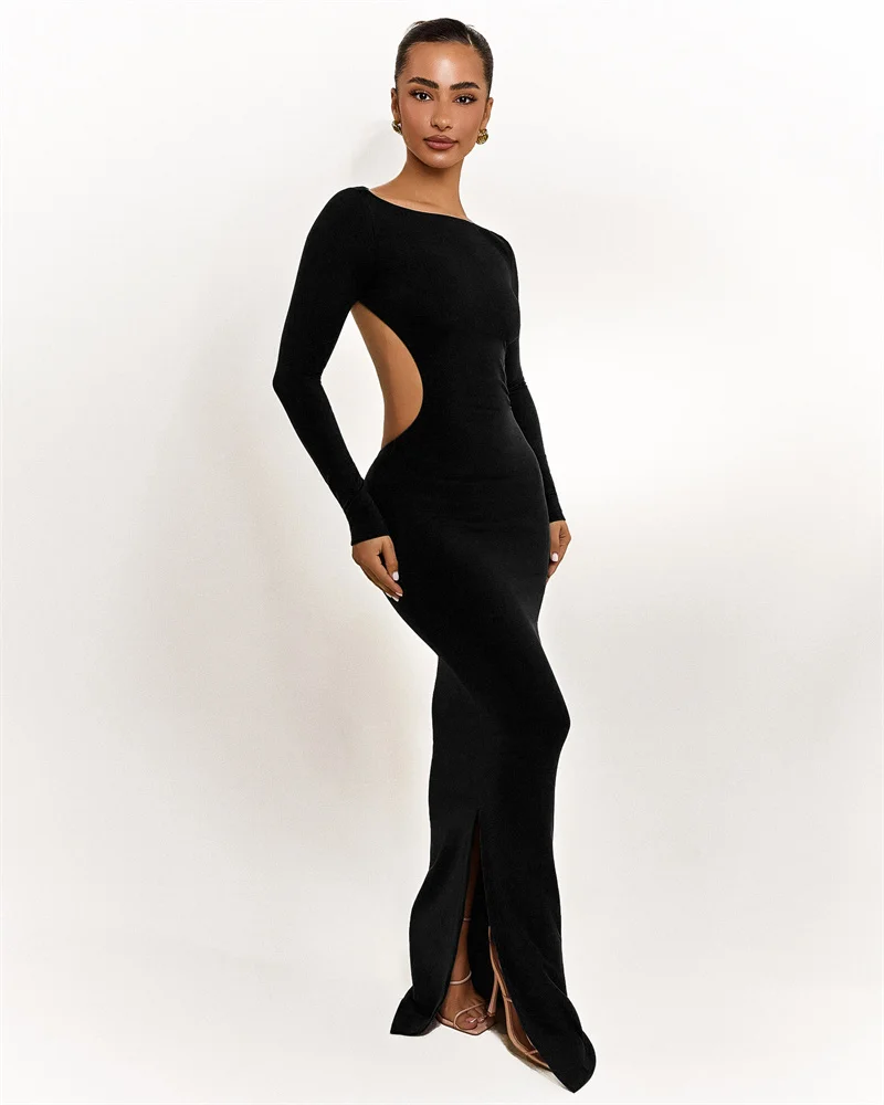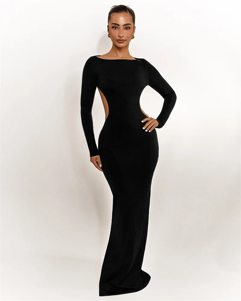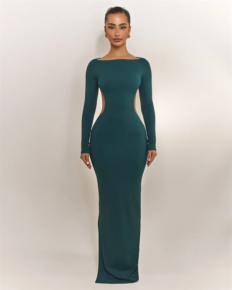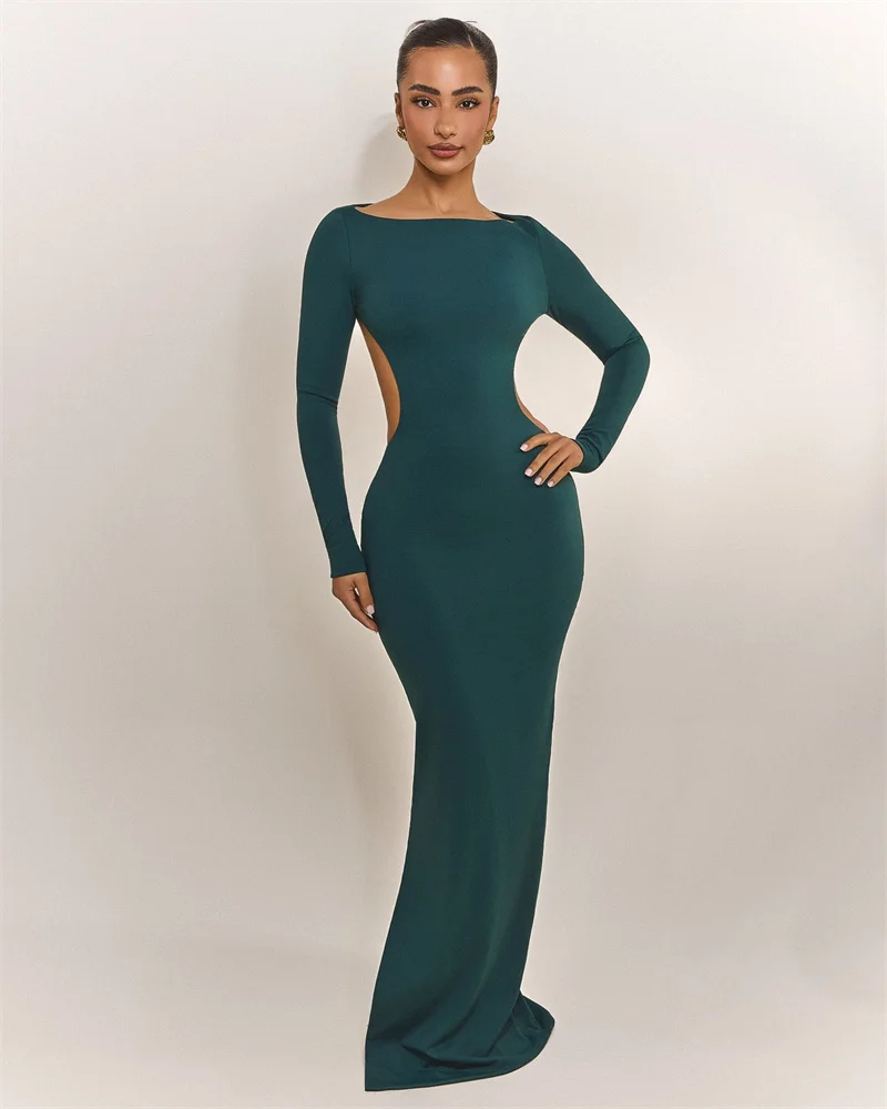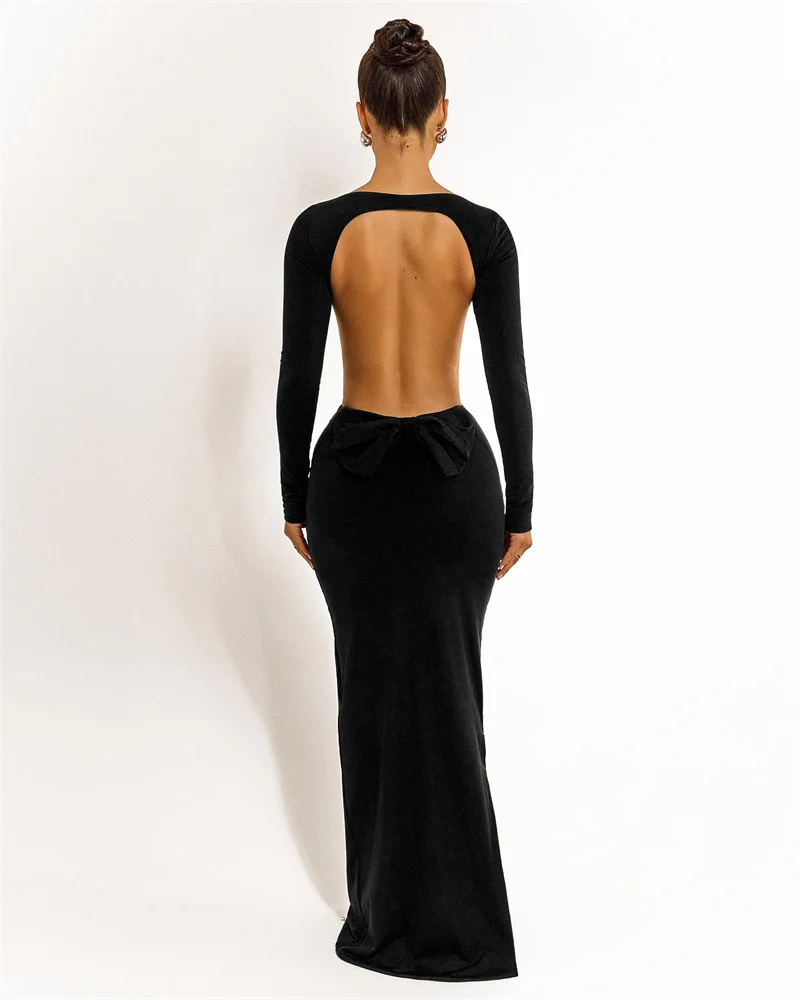 Mozision Backless Bow Long Sleeve Sexy Maxi Dress Women Gown Elegant O Neck High