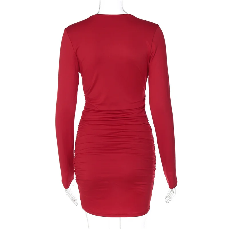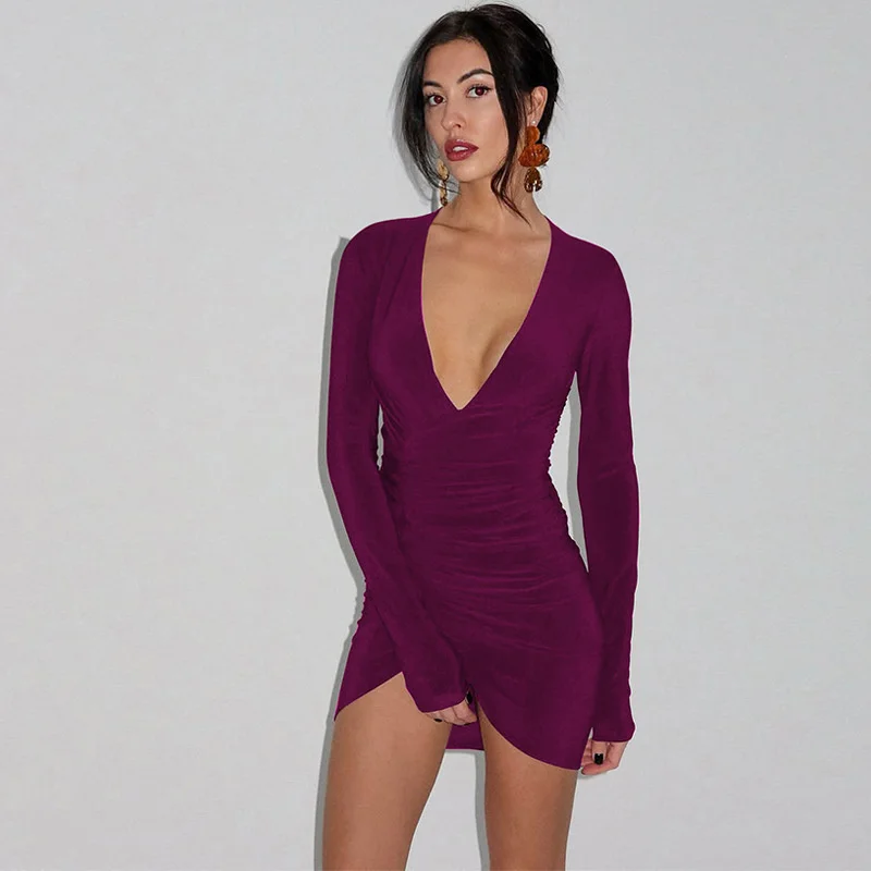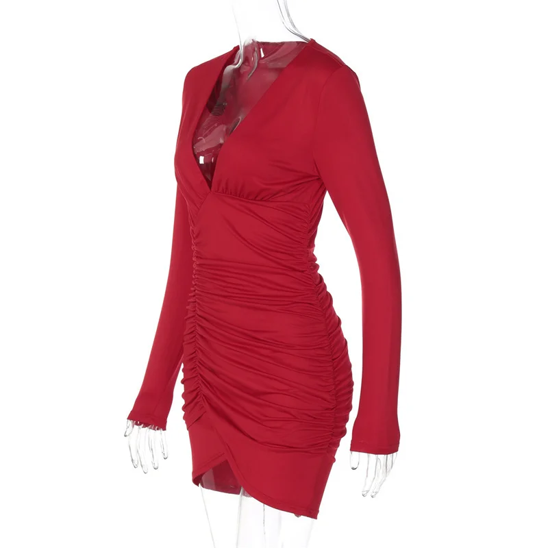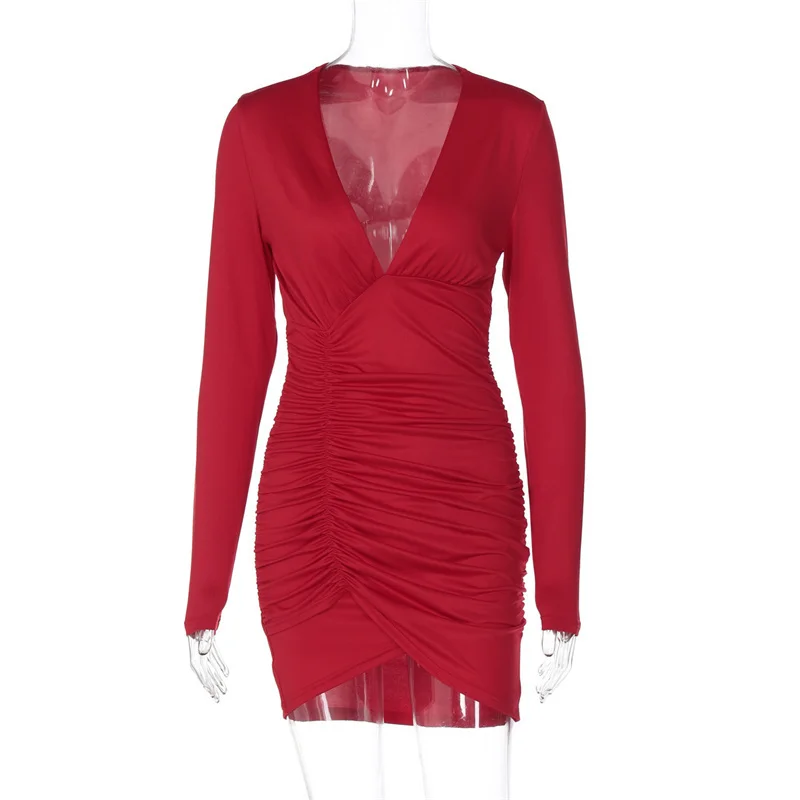 Mozision Deep V Neck Long Sleeve Ruched Sexy Mini Dress Women Autumn Winter New