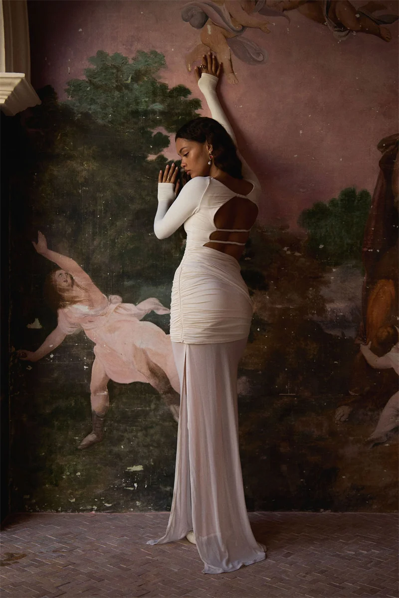 Mozision Long Sleeve Backless Ruched Sexy Maxi Dress Women Gown Elegant Patchwor