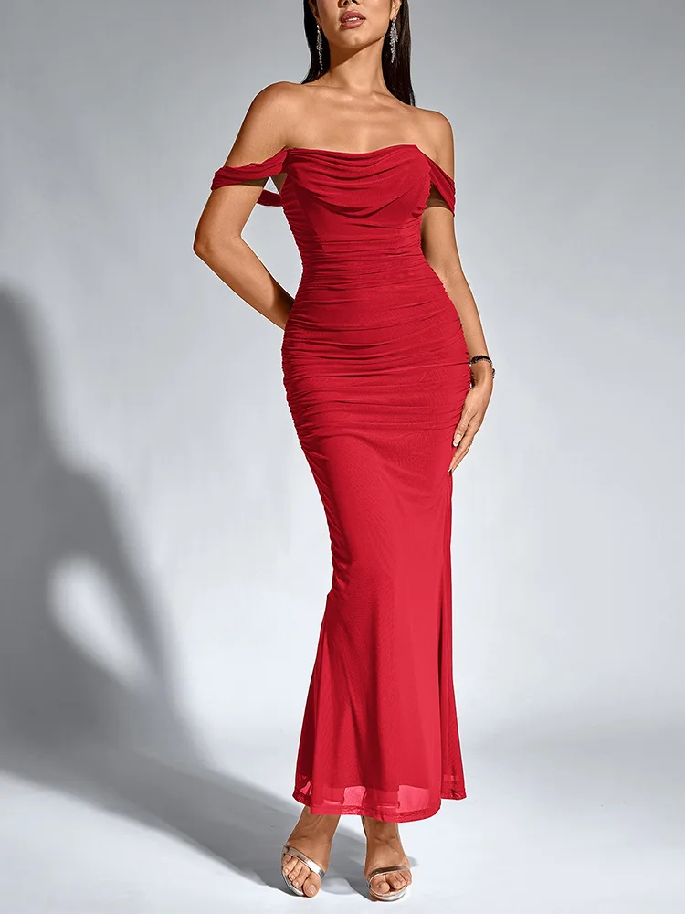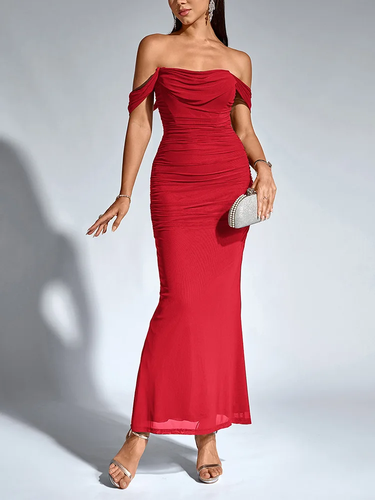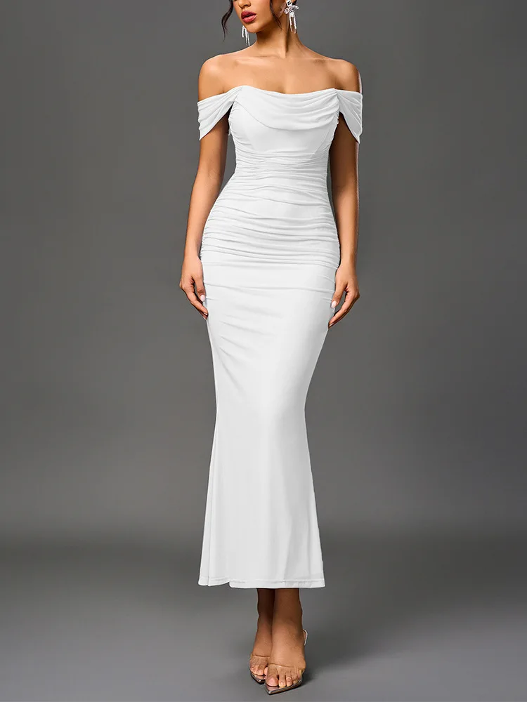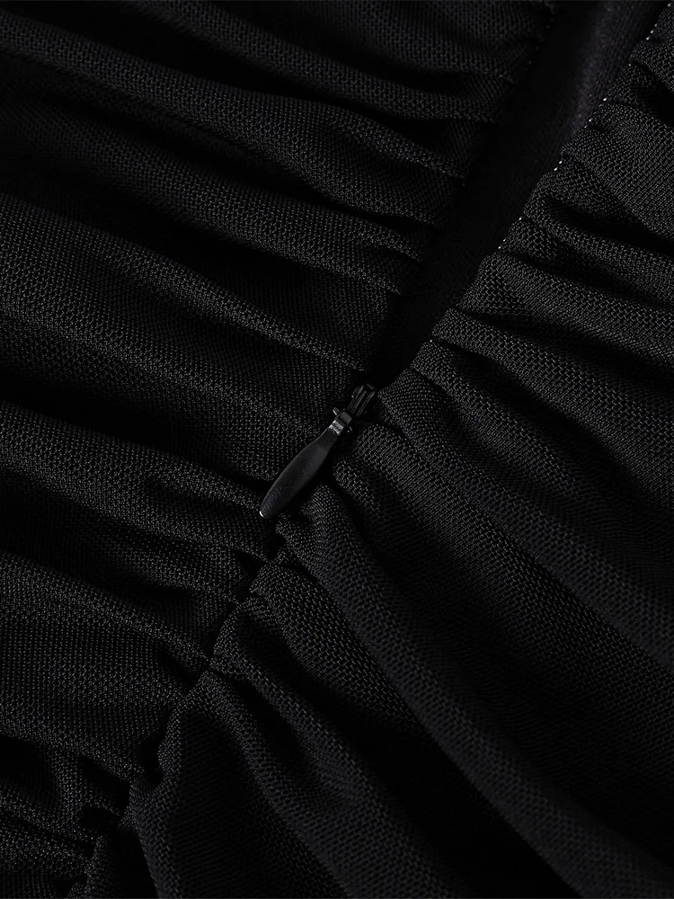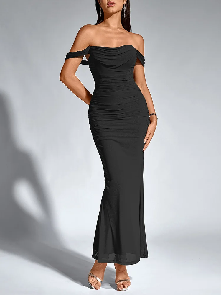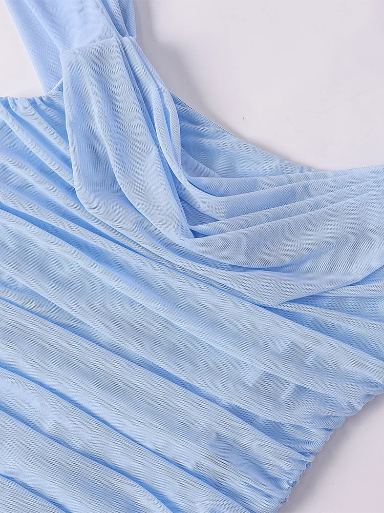 Sexy One Shoulder Tight Fitting Pleated Net Skirt Wrap Bodycon Dress Polyester H
