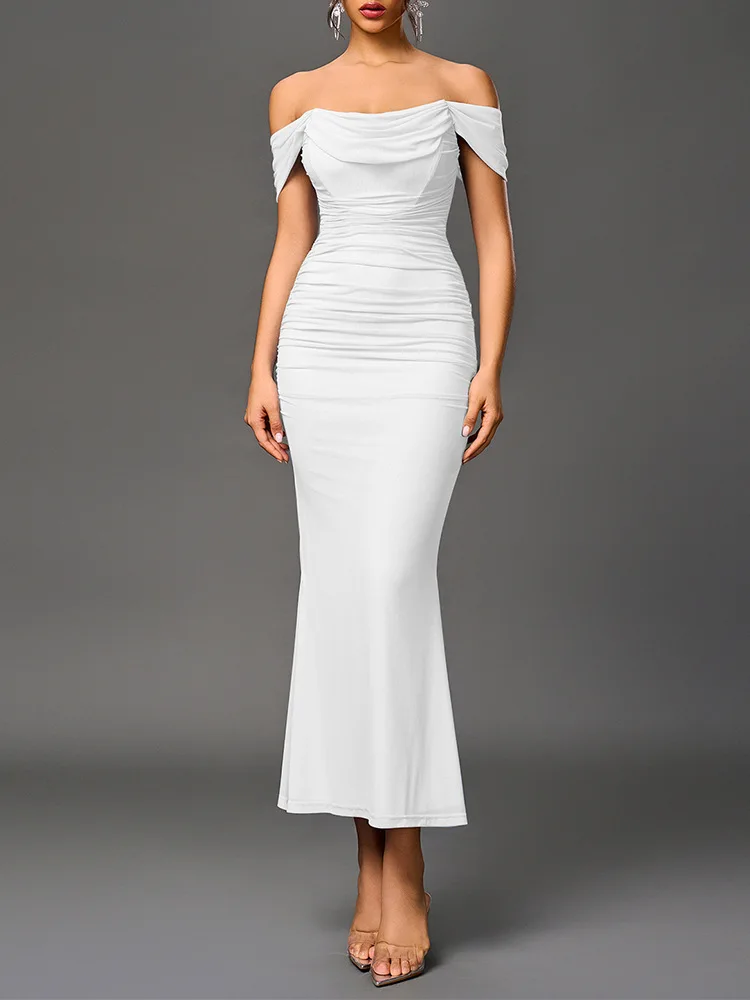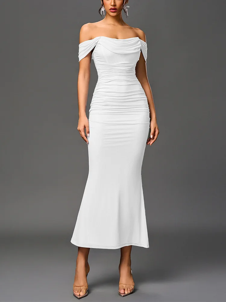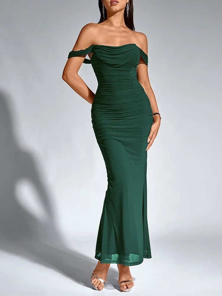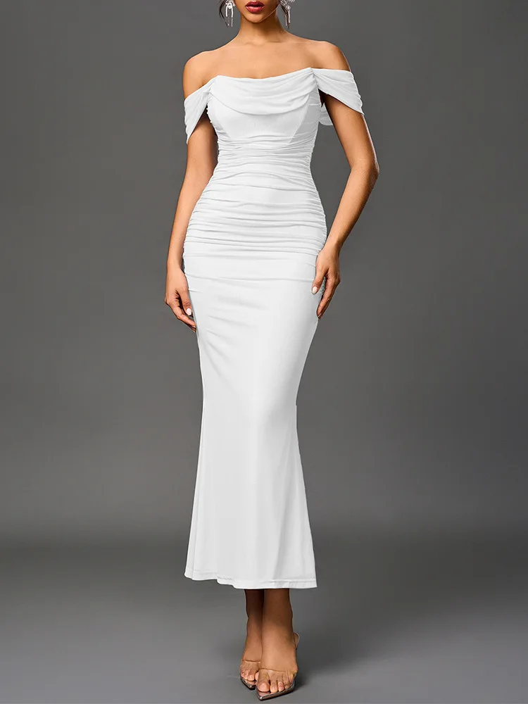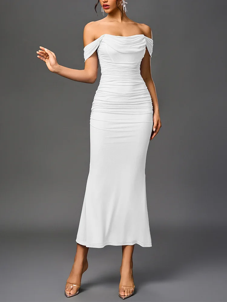 Sexy One Shoulder Tight Fitting Pleated Net Skirt Wrap Bodycon Dress Polyester H