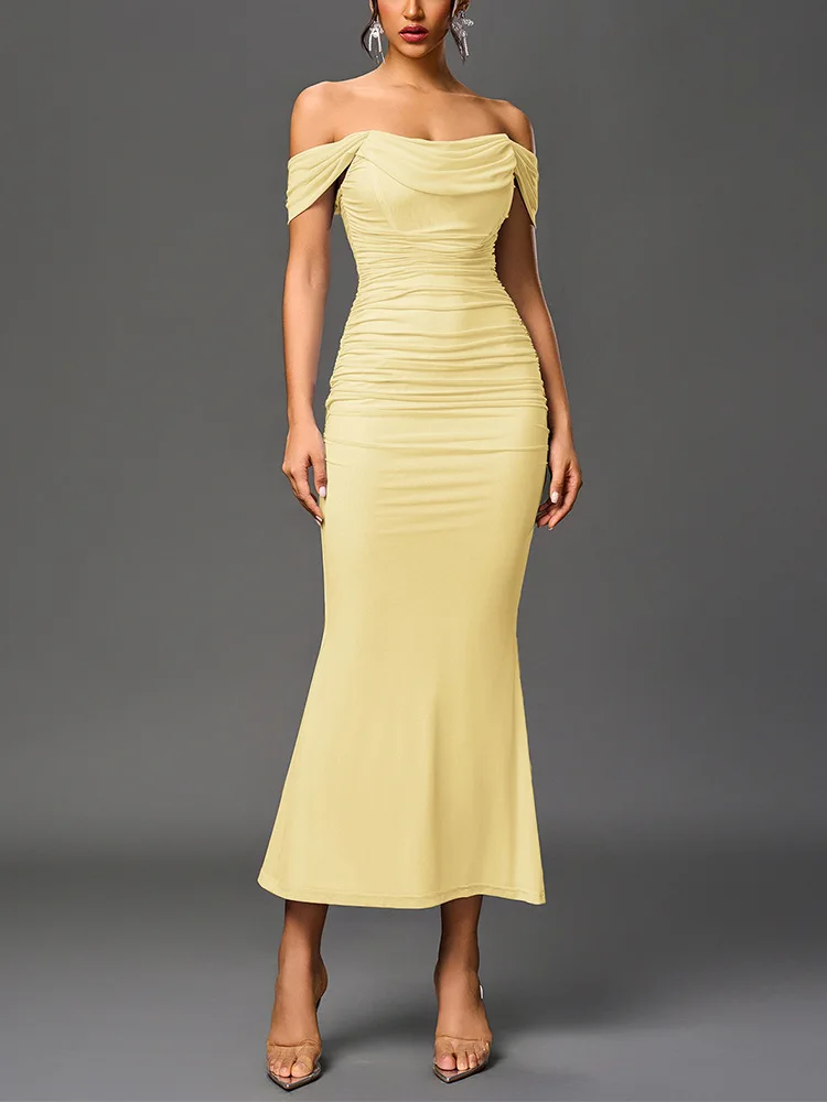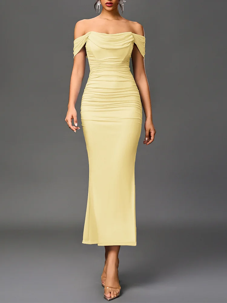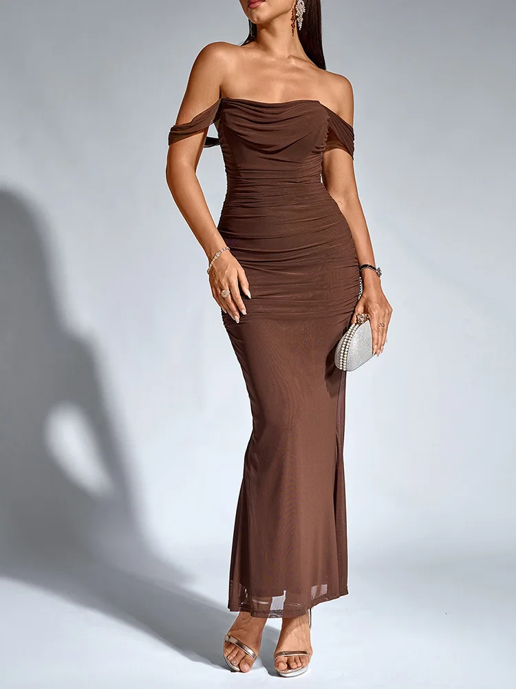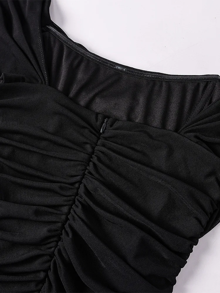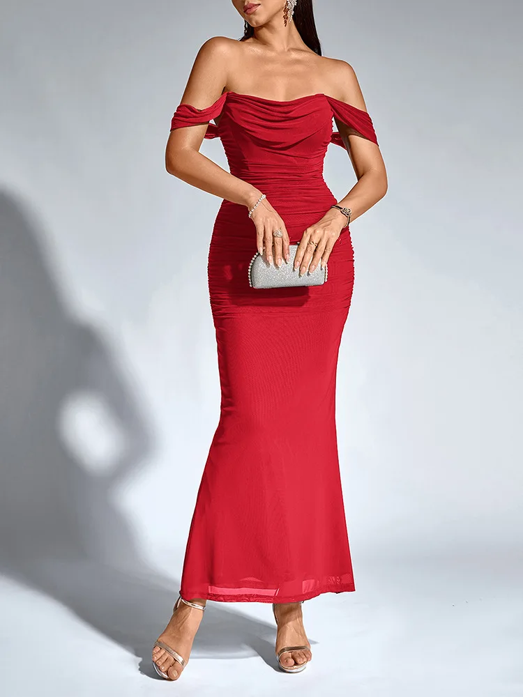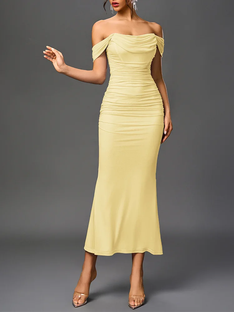 Sexy One Shoulder Tight Fitting Pleated Net Skirt Wrap Bodycon Dress Polyester H