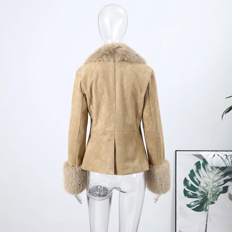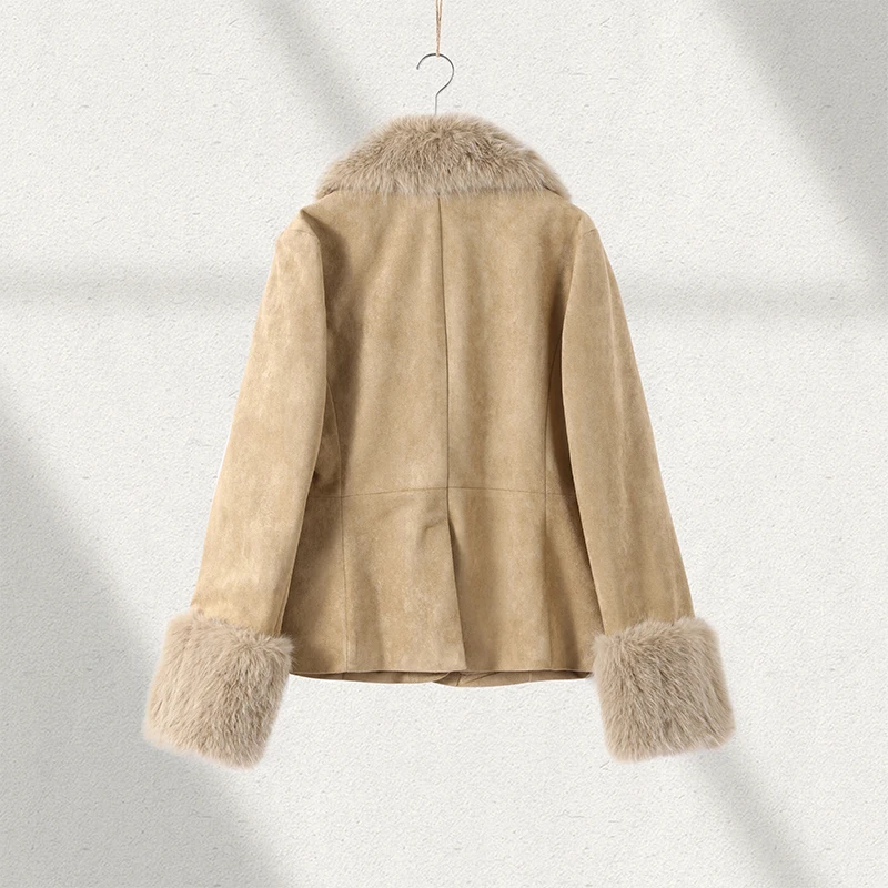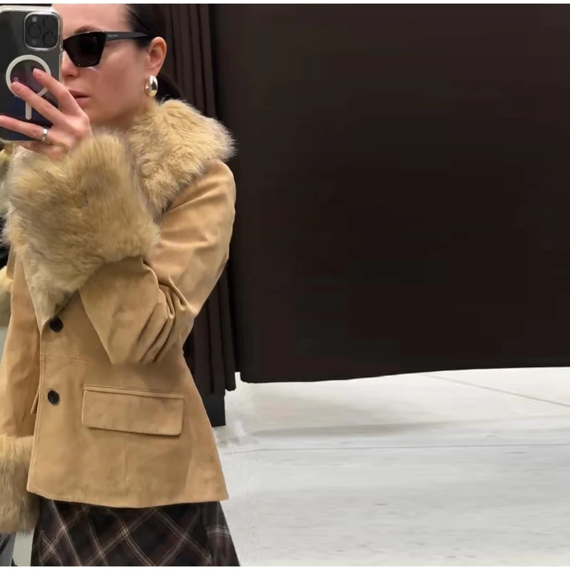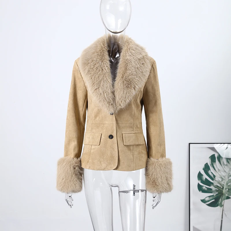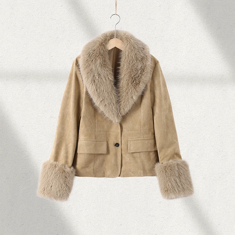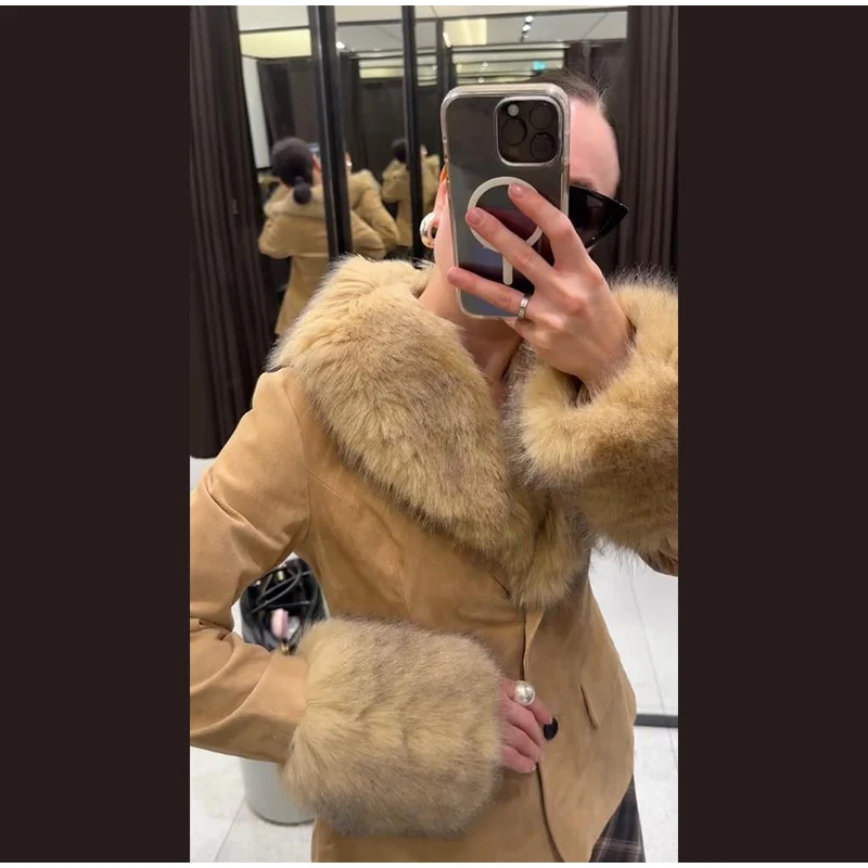 Stylish Faux Fur Patchwork Jacket Women Solid Lapel Long Sleeve Button Pocket Fe