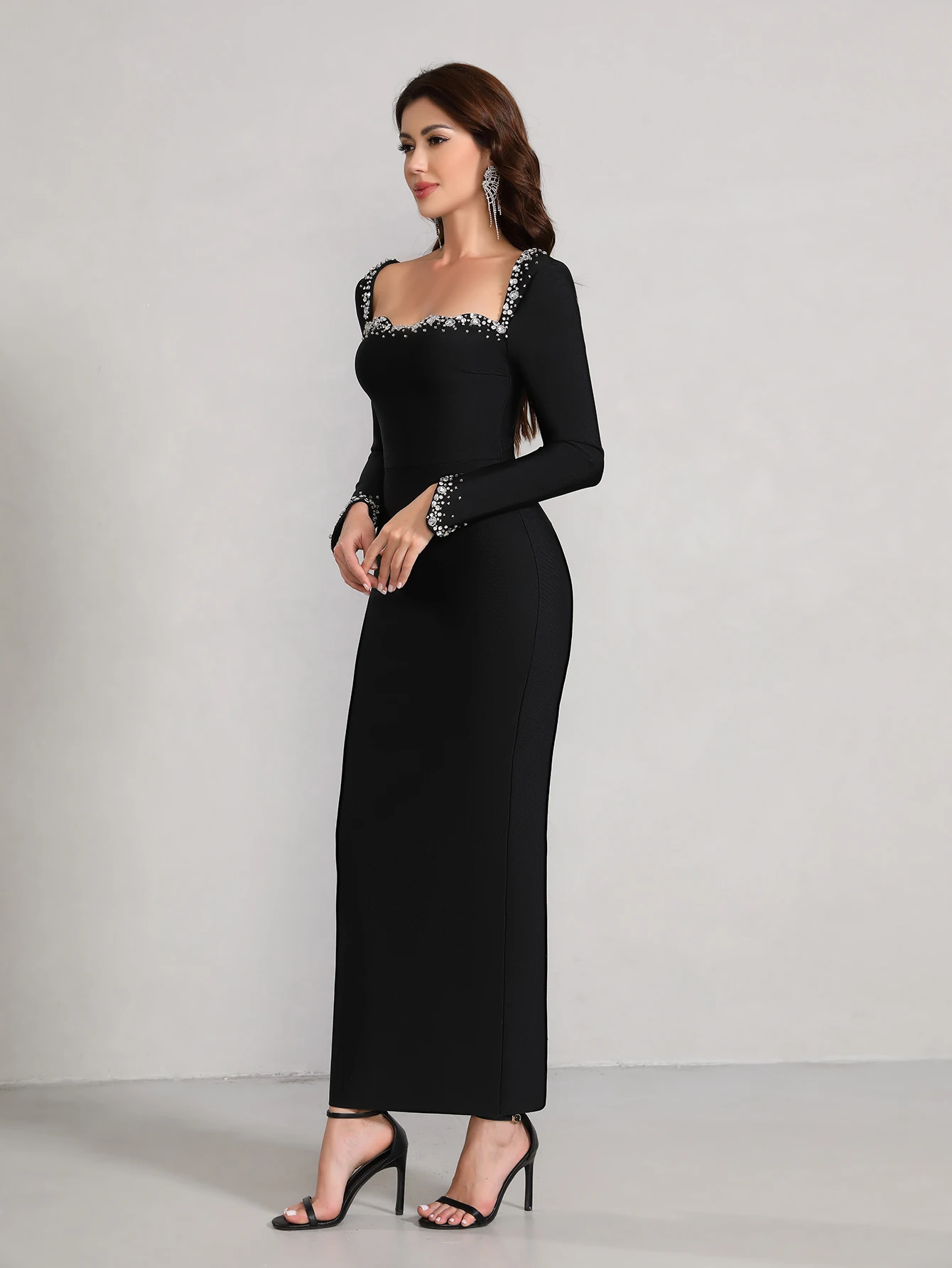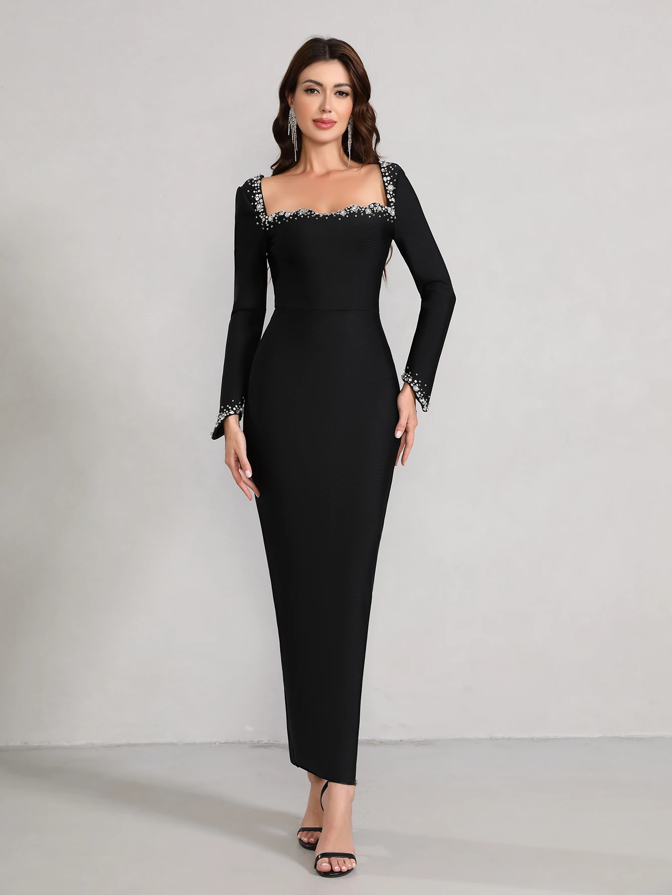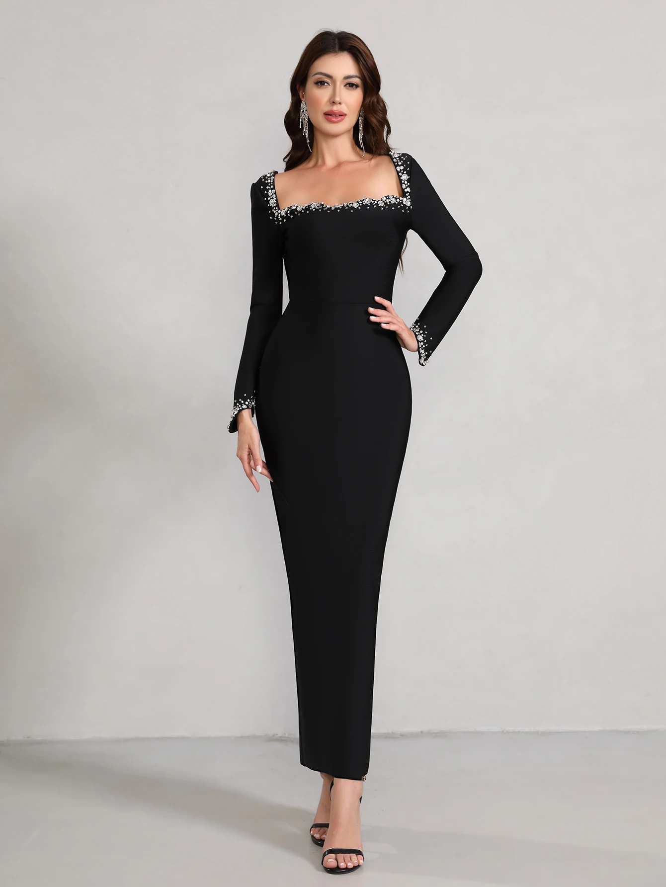 wholesale Autumn Winter Black long sleeves Hand-sewn Rhinestones Sexy Celebrity
